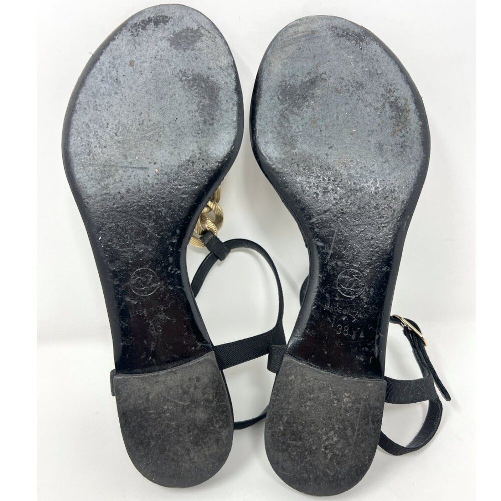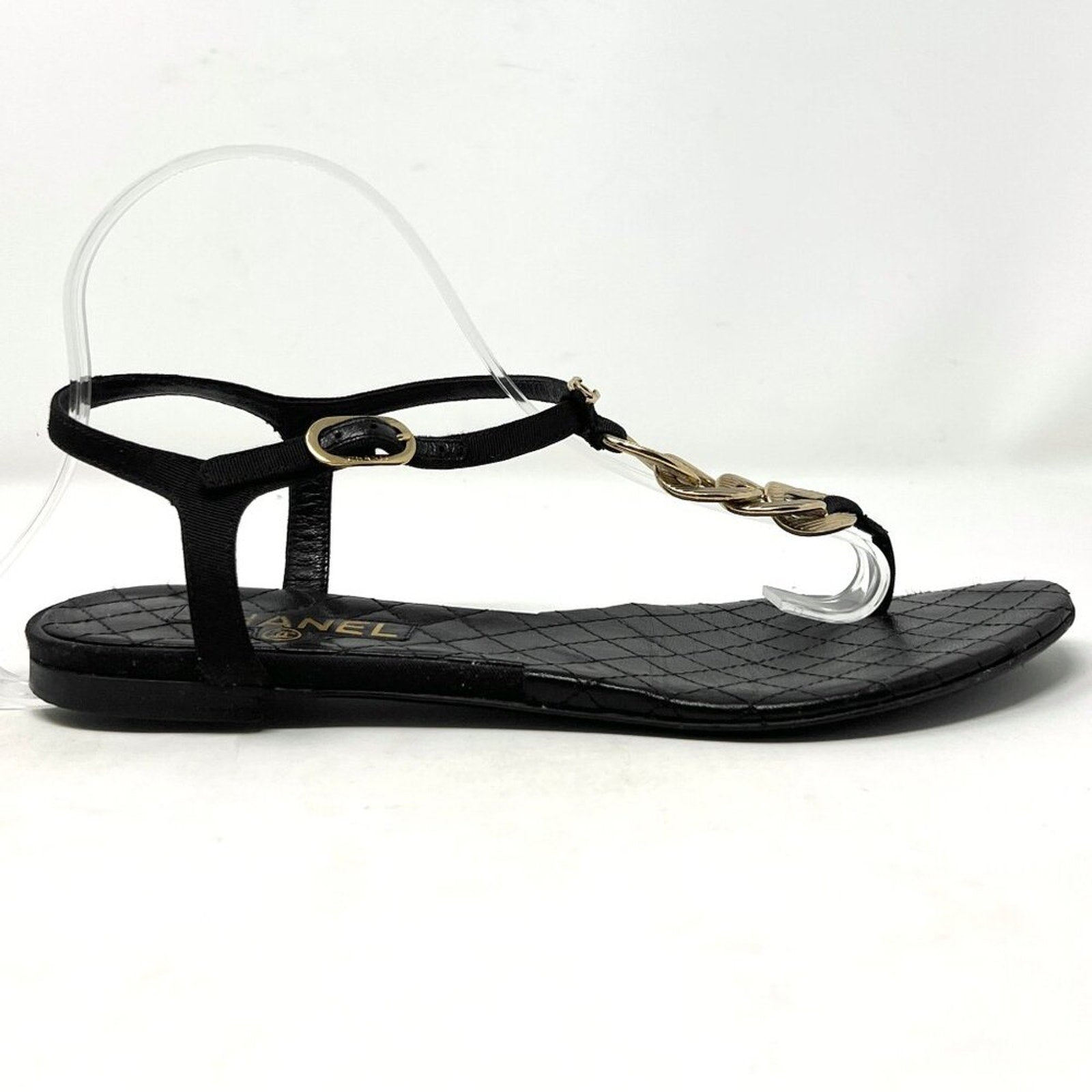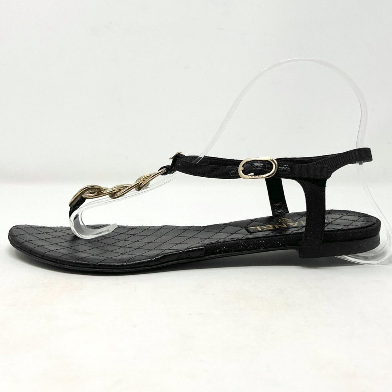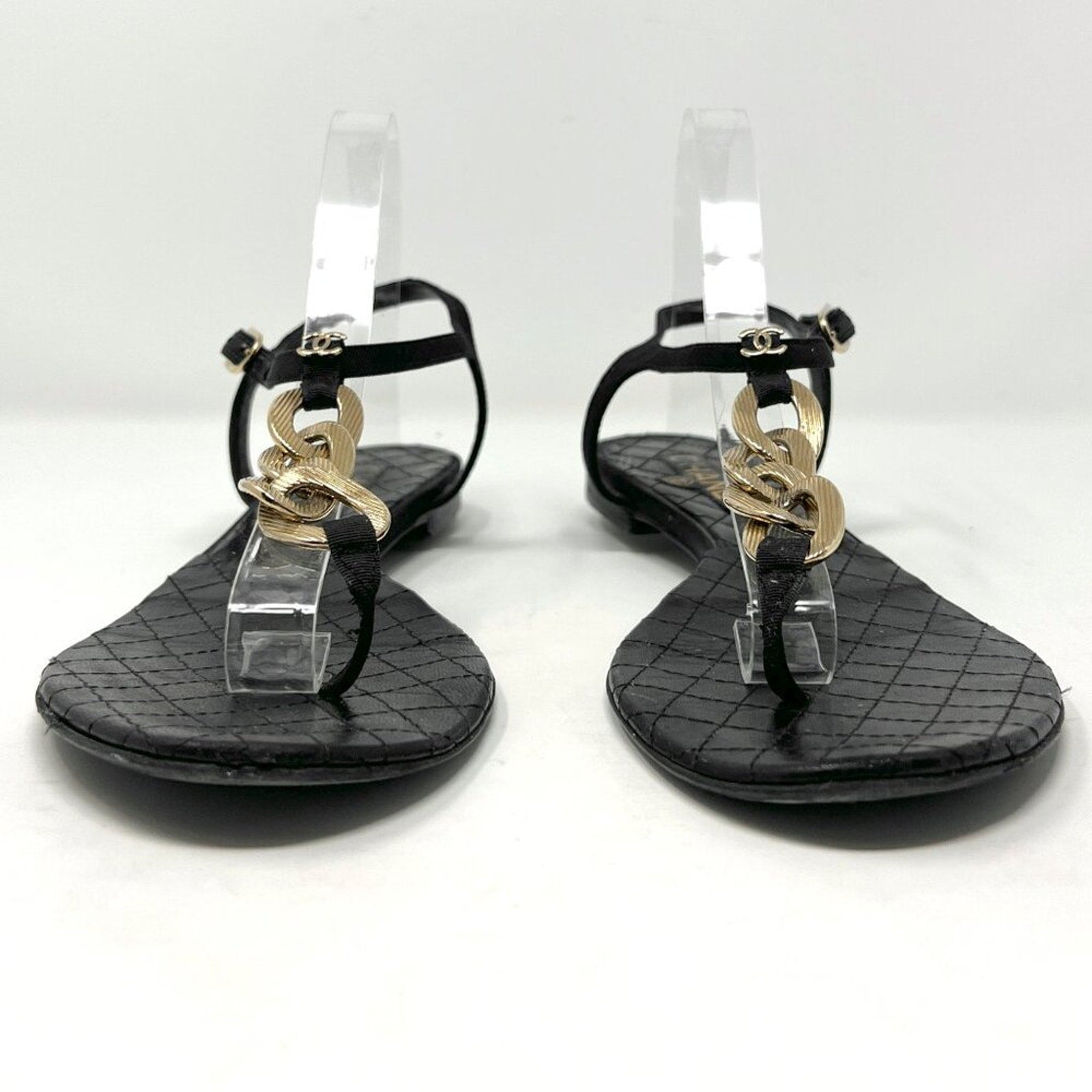 Keywords: Chanel G26433, Chanel thong sandals, quilted Chanel flats, black leather Chanel sandals, gold chain CC shoes, Chanel size 38, flat designer sandals, 09P Chanel shoes, luxury summer shoes, travel sandals, made in Italy, Karl Lagerfeld Chanel, timeless Chanel style, US 7.5, US8.