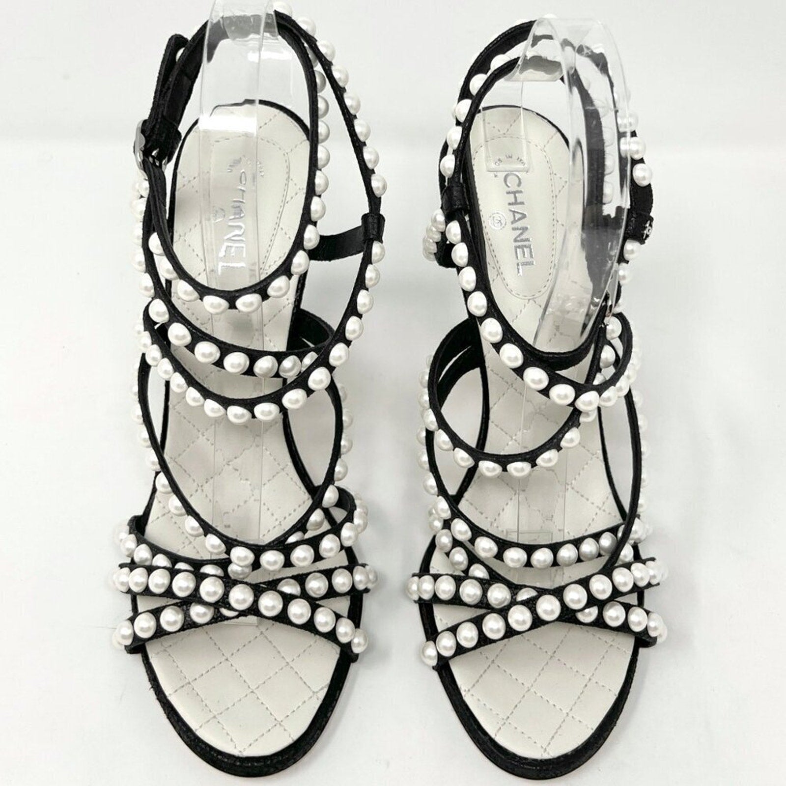 Chanel pearl heels, Chanel G33715, Chanel X51542, Chanel 18S, black lambskin sandals, pearl strappy heels, CC logo heels, Chanel size 39, 9 US Chanel shoes, Chanel stiletto sandals, quilted footbed, bridal Chanel heels, party heels, rare Chanel shoes, Karl Lagerfeld Chanel, made in Italy.