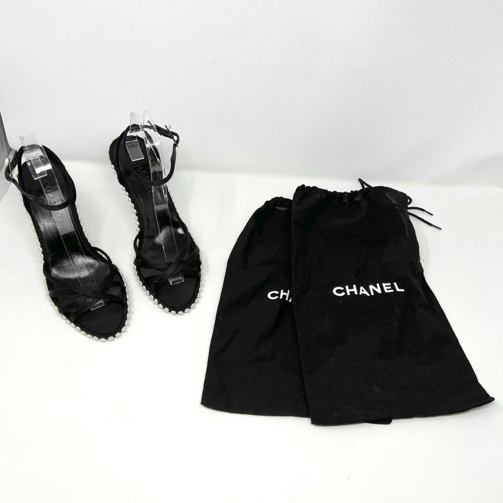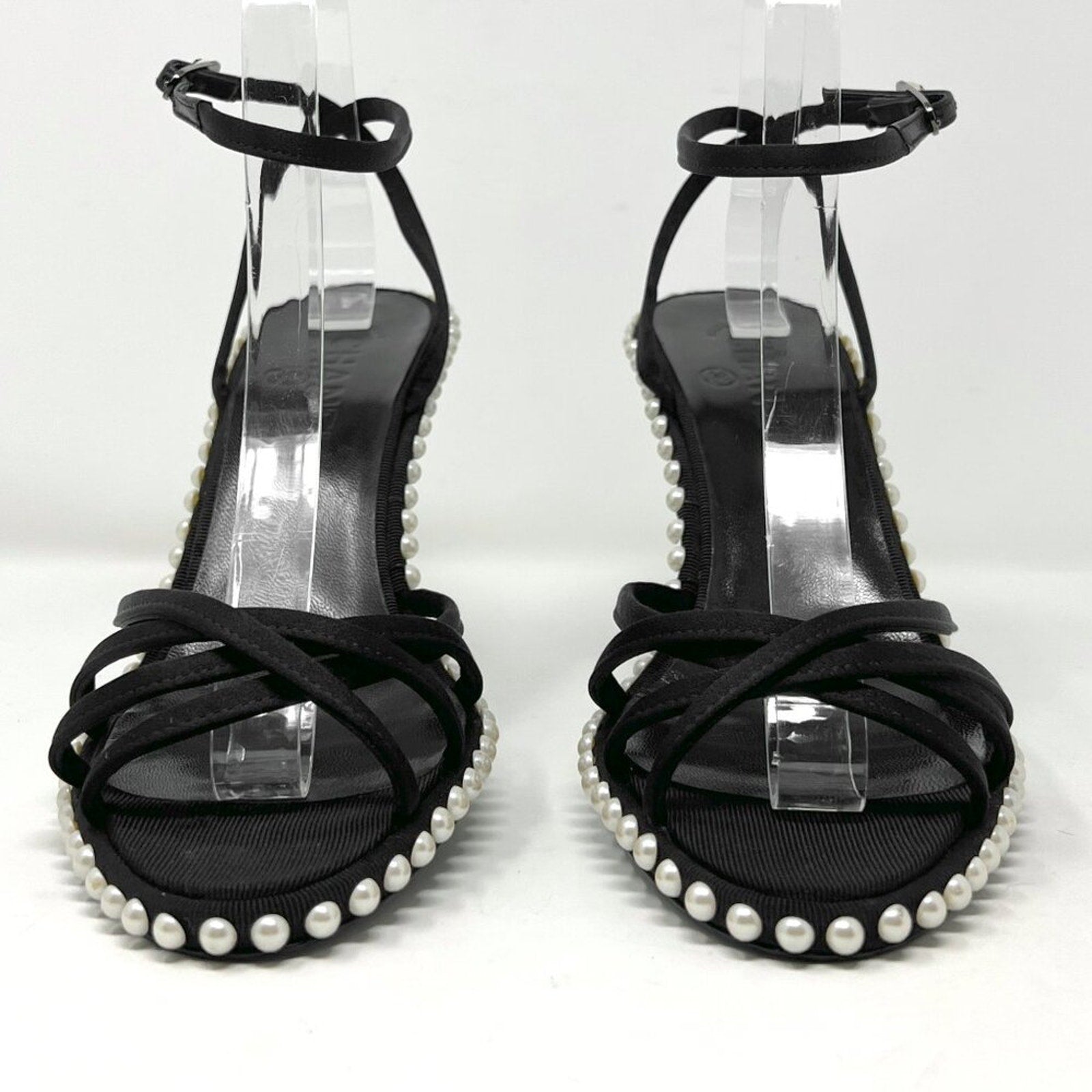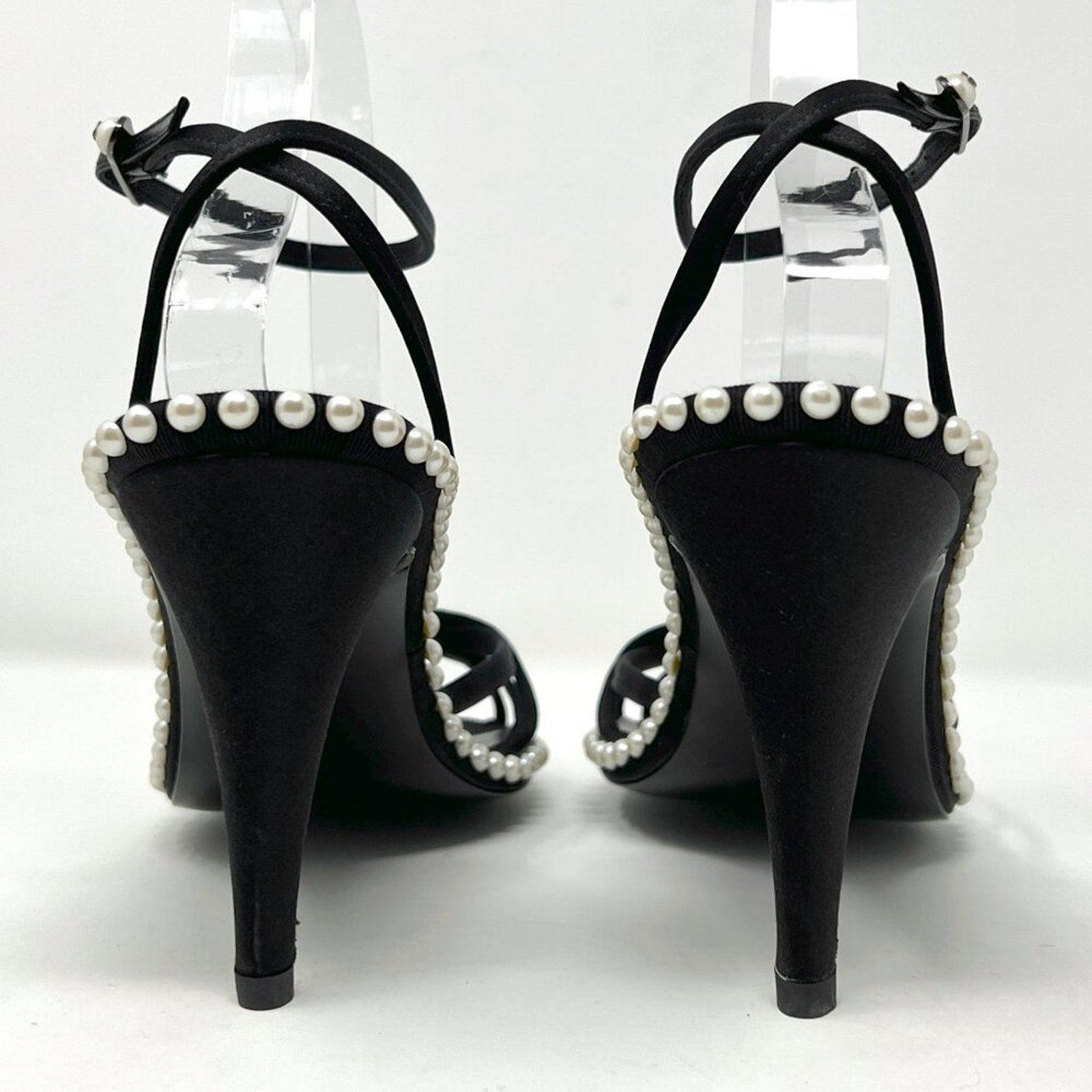 Chanel 2004 sandals, vintage Chanel heels, pearl sandals, Karl Lagerfeld Chanel, runway archive, black satin strappy heels, collectible Chanel shoes, rare Chanel footwear, y2k fashion, y2k designer shoes.