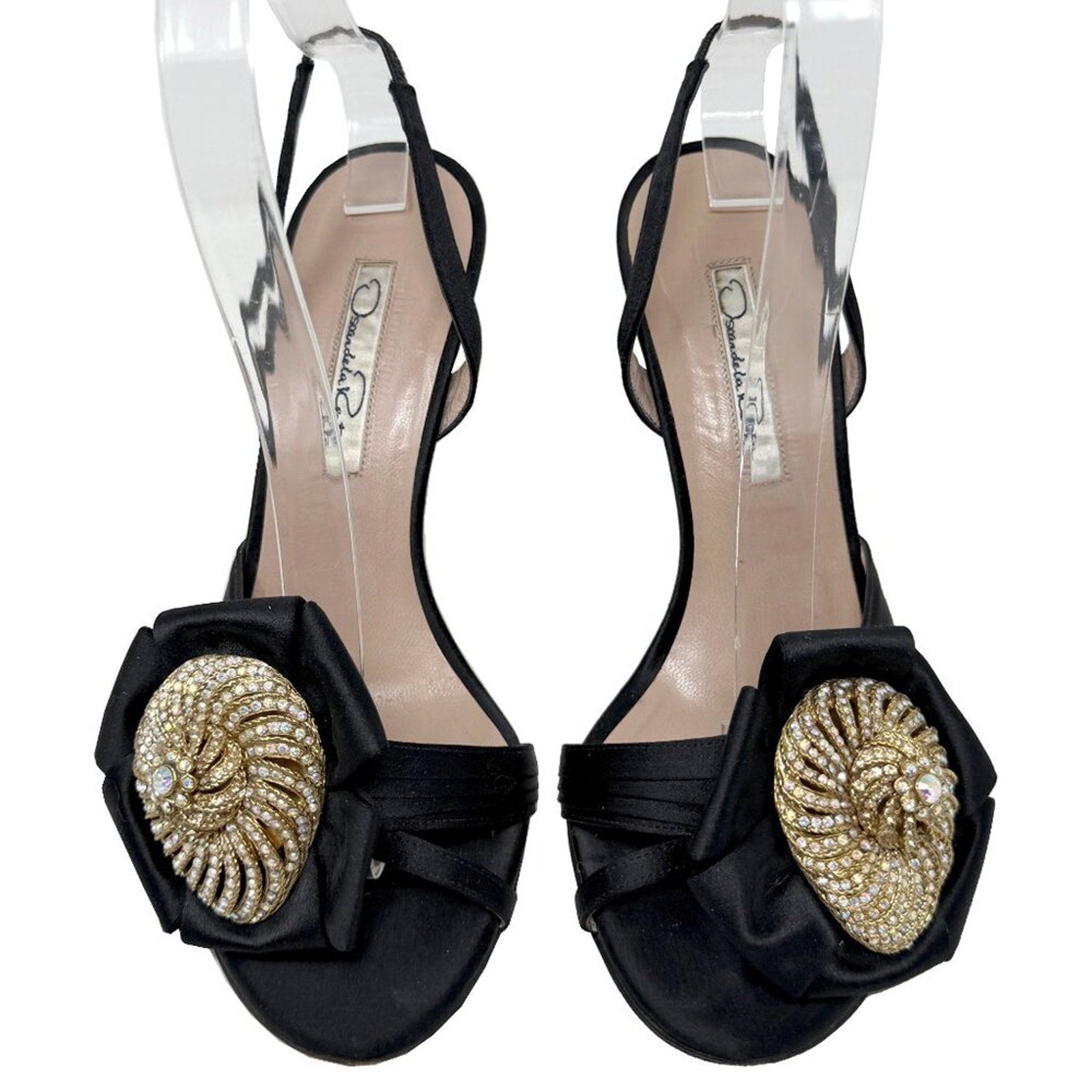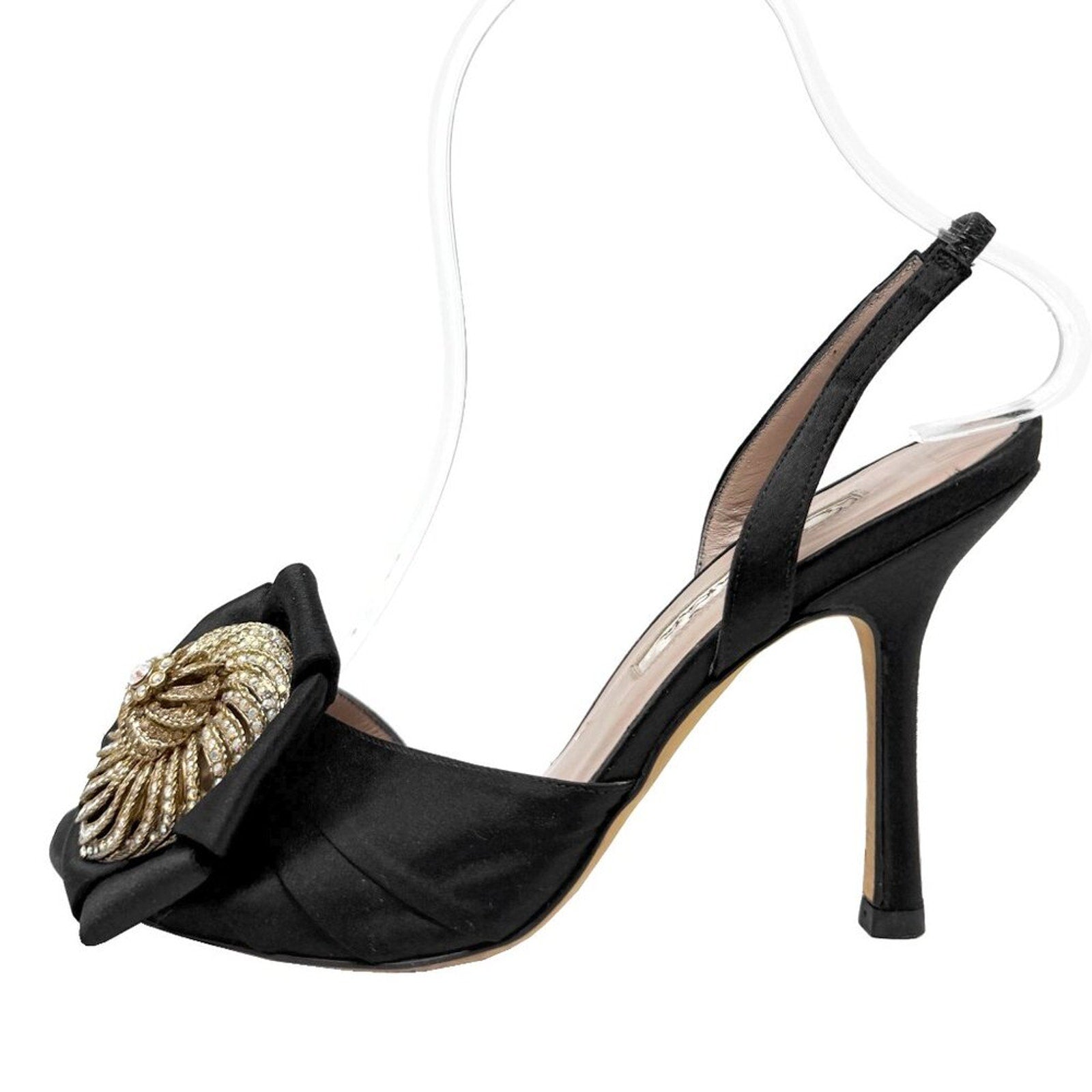 Oscar de la Renta Black Satin Crystal Bow Slingback Heels 36.5