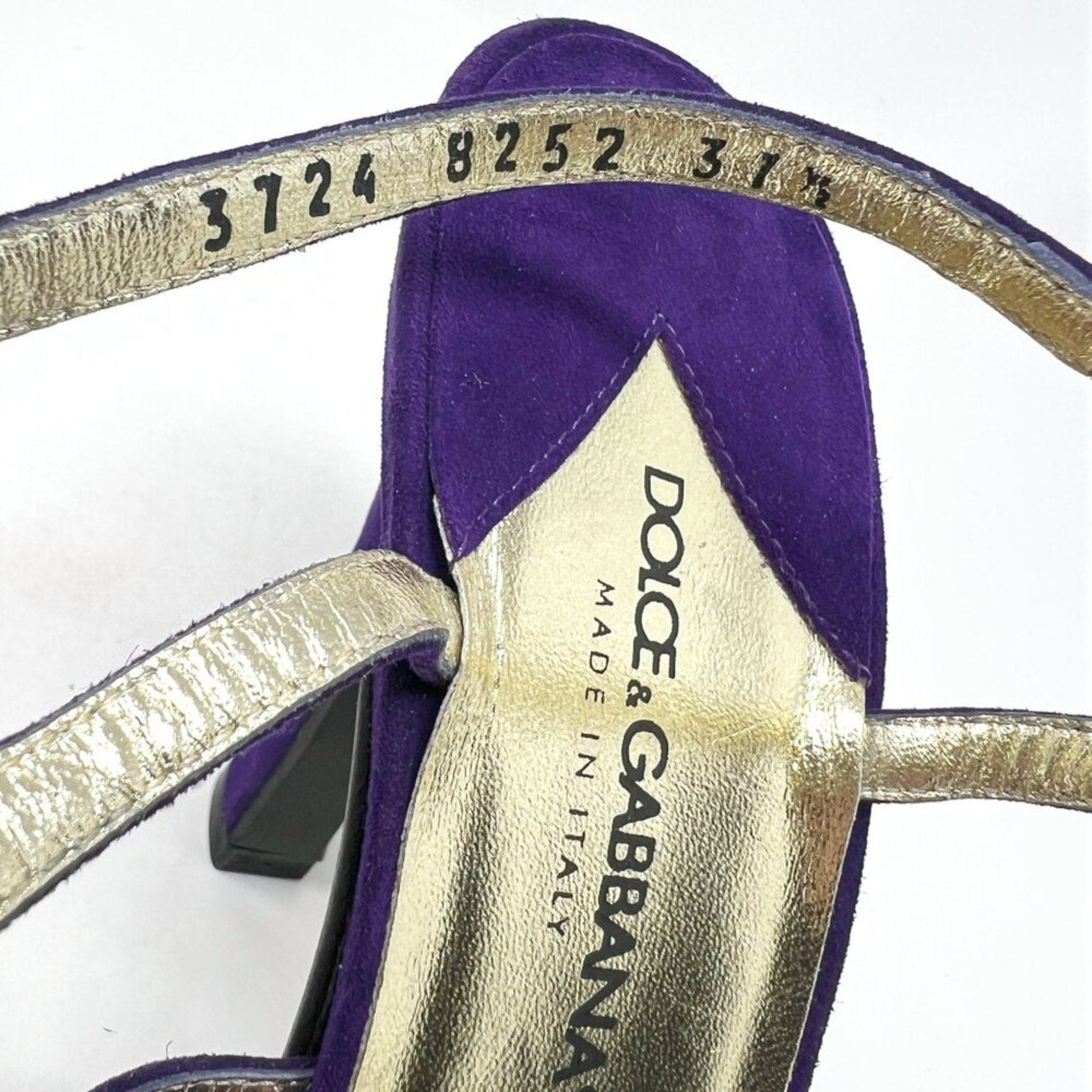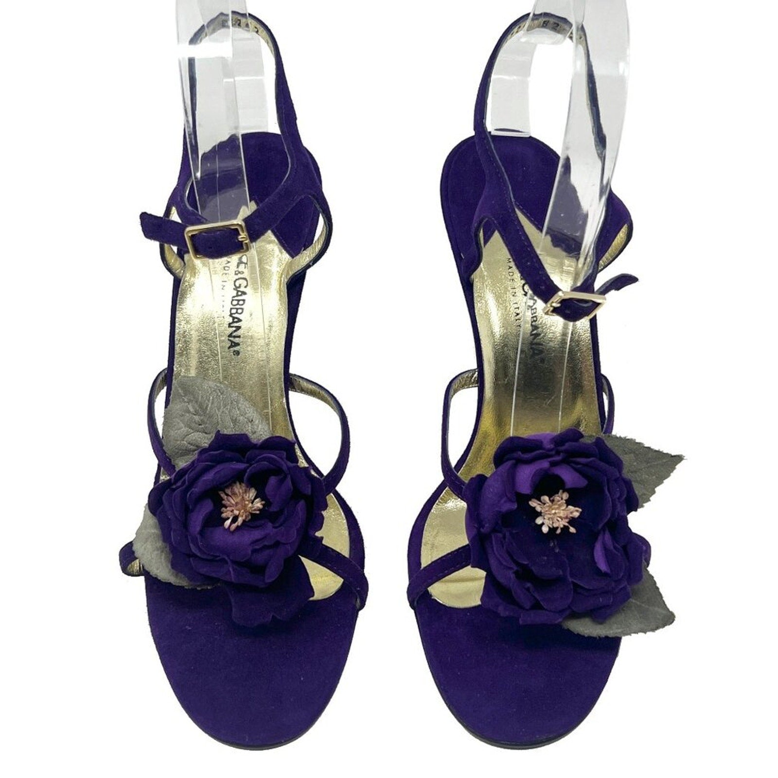 Straight from the Y2K era: vintage Dolce & Gabbana ankle-strap sandals in saturated purple suede with a couture-style 3D flower + leaf at the toe. Metallic gold leather footbed, slim stiletto, and leather “Vero Cuoio” soles—peak early-2000s Dolce glamour. Marked EU 37.5 (US 7-.7.5). Inside strap code: 3724 8252 37½. Made in Italy.